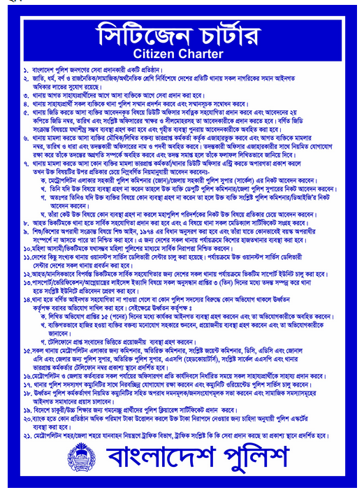 ১২। সকল থানায় মেট্রোপলিটন এলকার জন্য কমিশনার, অতিরিক্ত কমিশনার, সংশ্লিষ্ট জয়েন কমিশনার, ডিসি, এডিসি এবং জোনাল এসি এবং জেলার জন্য পুলিশ সুপার,অতিরিক্ত পুলিশ সুপার,এএসপি(হেডকোয়ার্র্টার্স), সংশ্লিষ্ট সার্কেল এএসপি এবং অফিসার ইনচার্জগনের টেলিফোন নম্বর থানায় প্রকাশ্য স'ানে প্রদর্শিত হবে।